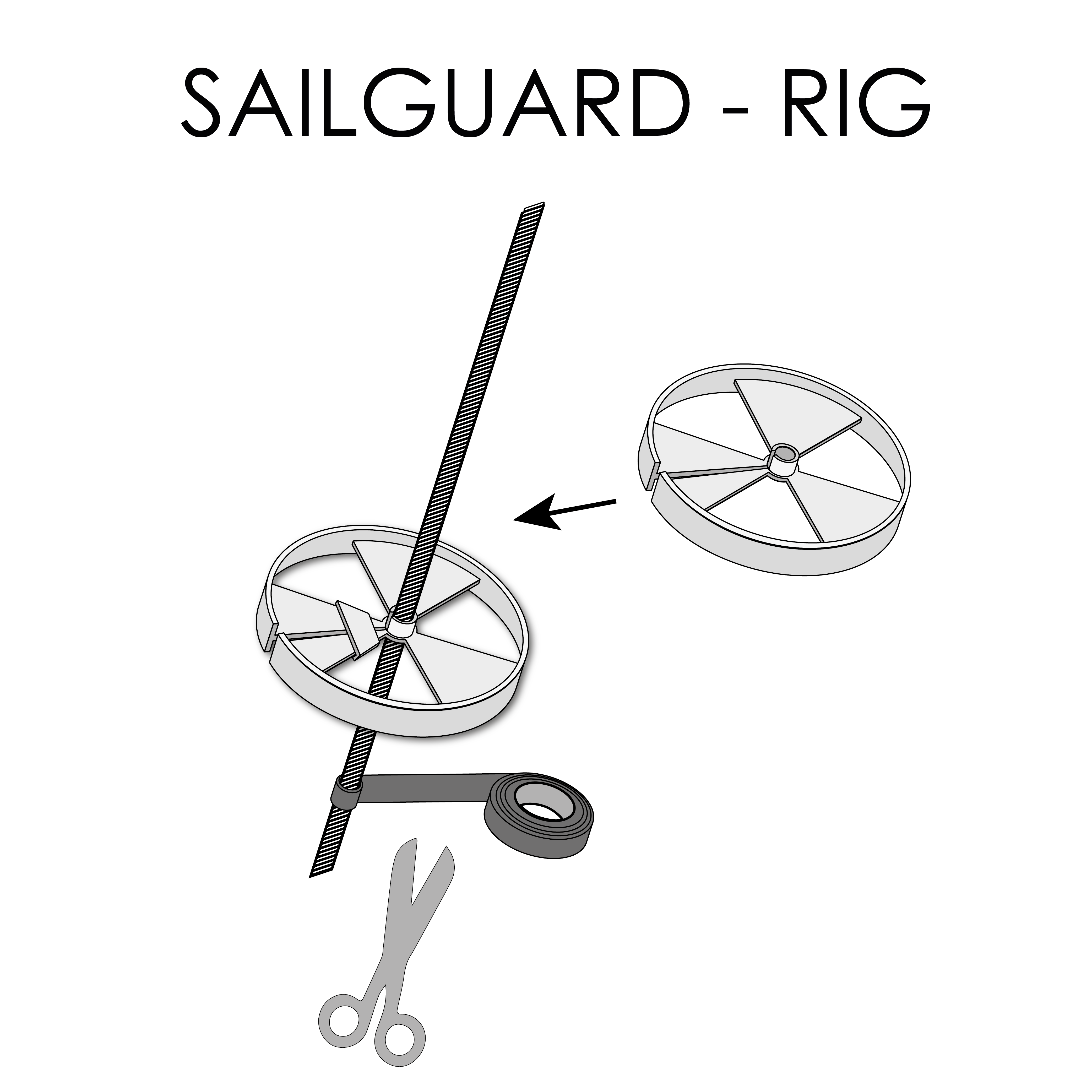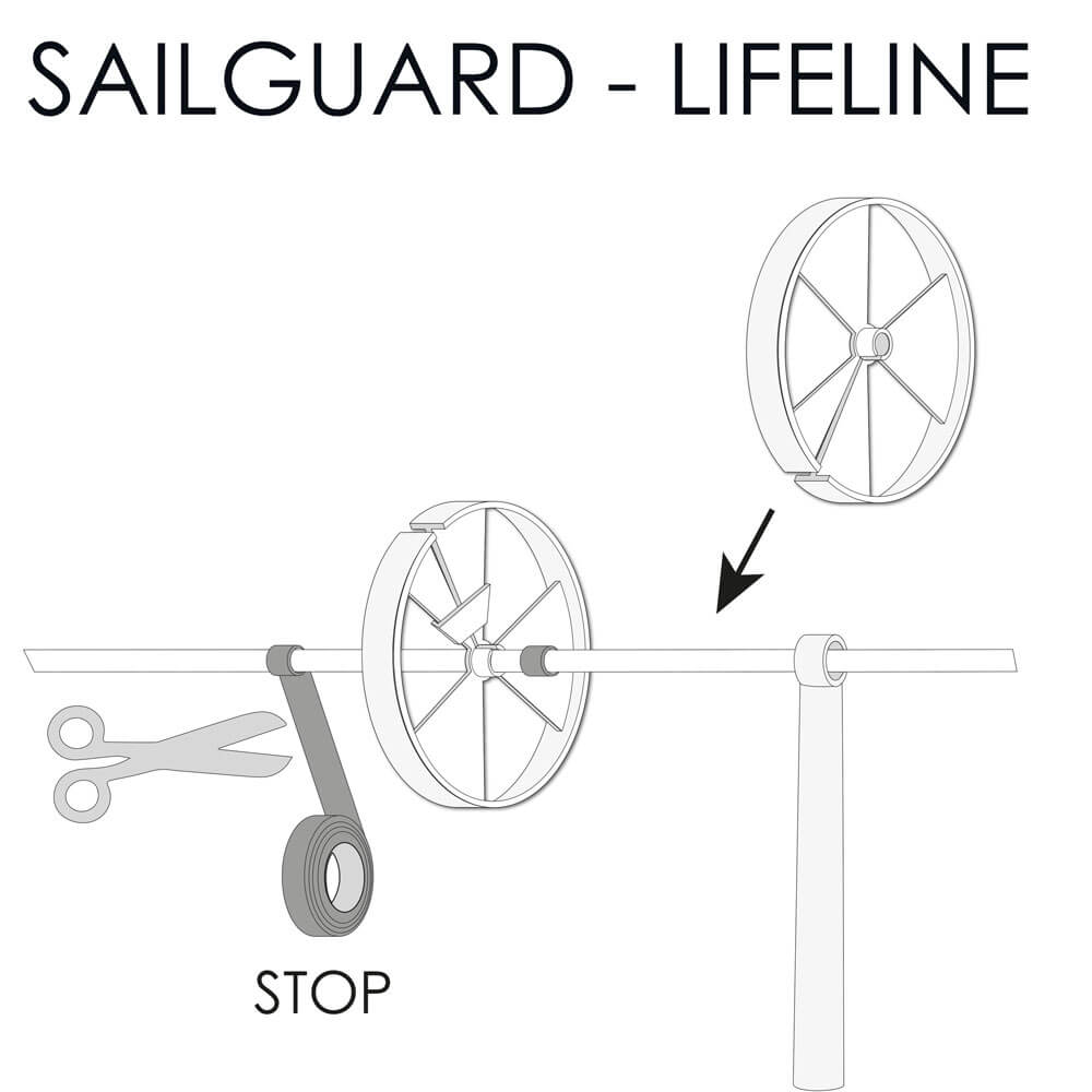 SAILGUARD is a wheel with a slot that can be opened and closed. This allows SAILGUARD to be attached to the railing, baby stay, or shrouds without a loose end. The center hole has a diameter of 6.5 mm—if necessary, it can be drilled out to a diameter of 9 mm.